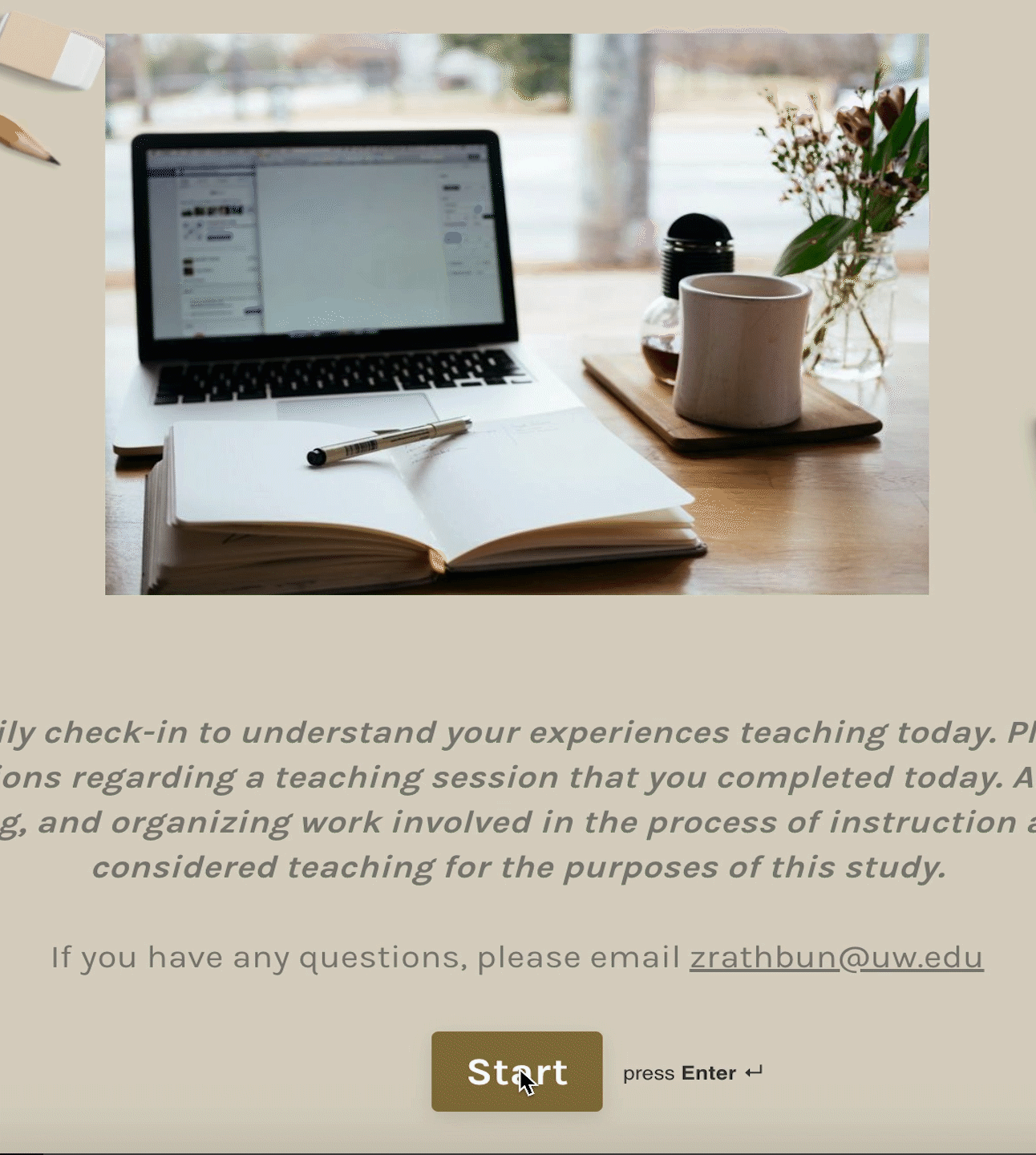 The goal of our diary study was to understand the daily experiences of teachers over one week of teaching. We asked them to respond to a short daily questionnaire about the activities and tools used in a given day. We also asked them to explain any particularly challenging or successful moments in their daily teaching routine.